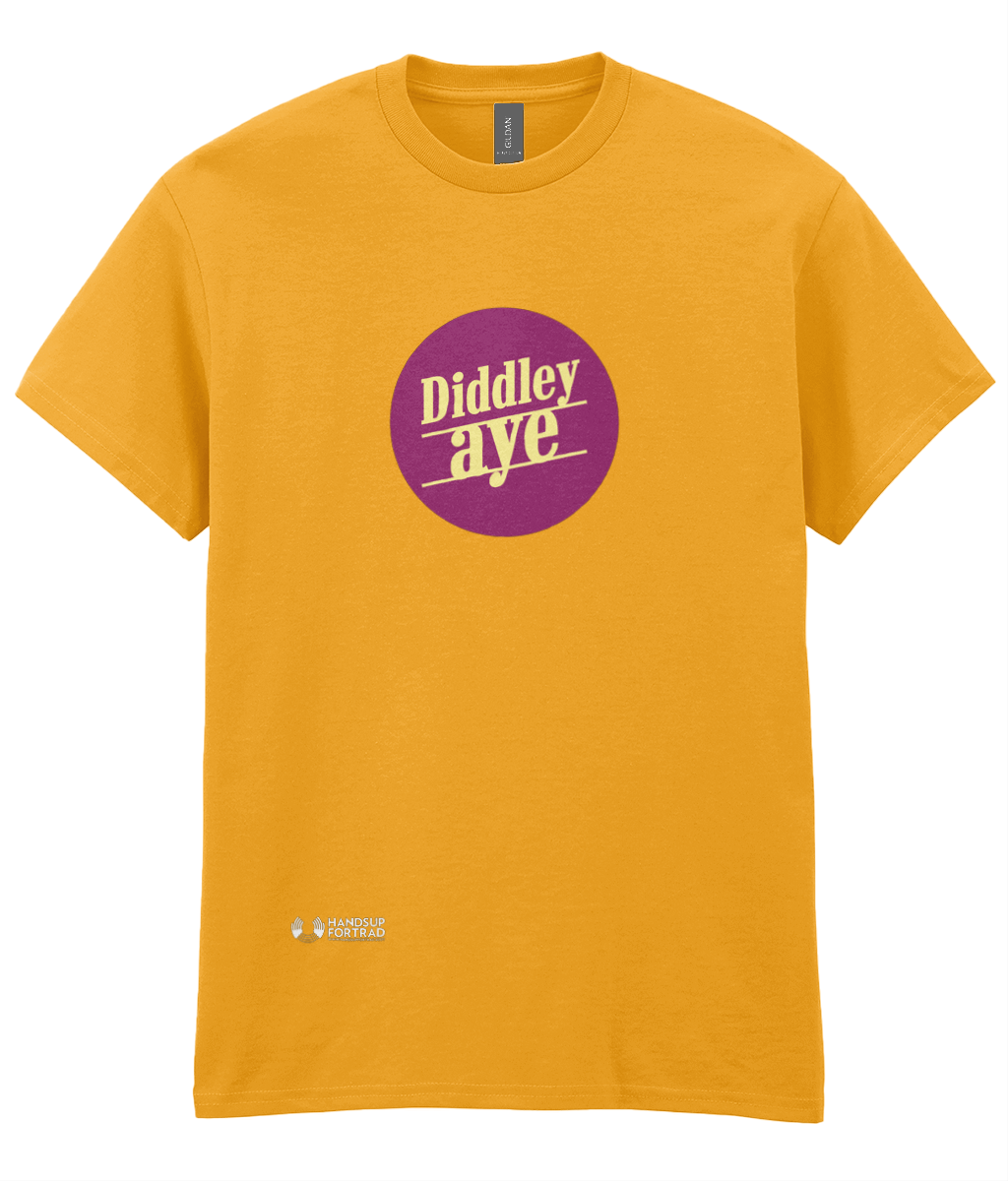 Diddley Aye is an expression for the dance tunes that we all play. In fact if you repeat diddley aye over and over you are practically playing a tune! Thanks for buying this t-shirt. All proceeds go to support the work of Hands Up for Trad.
