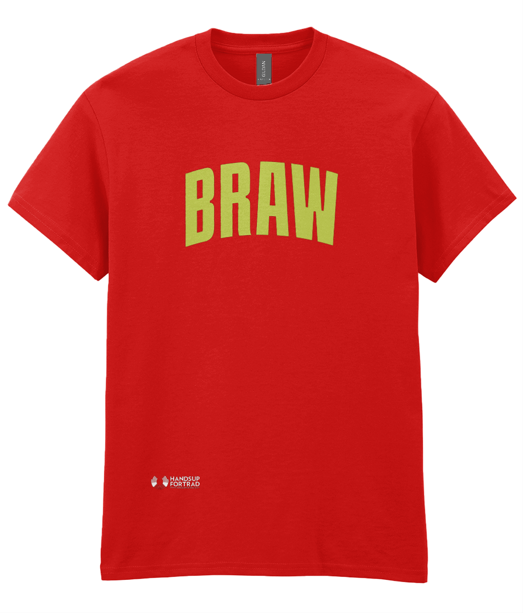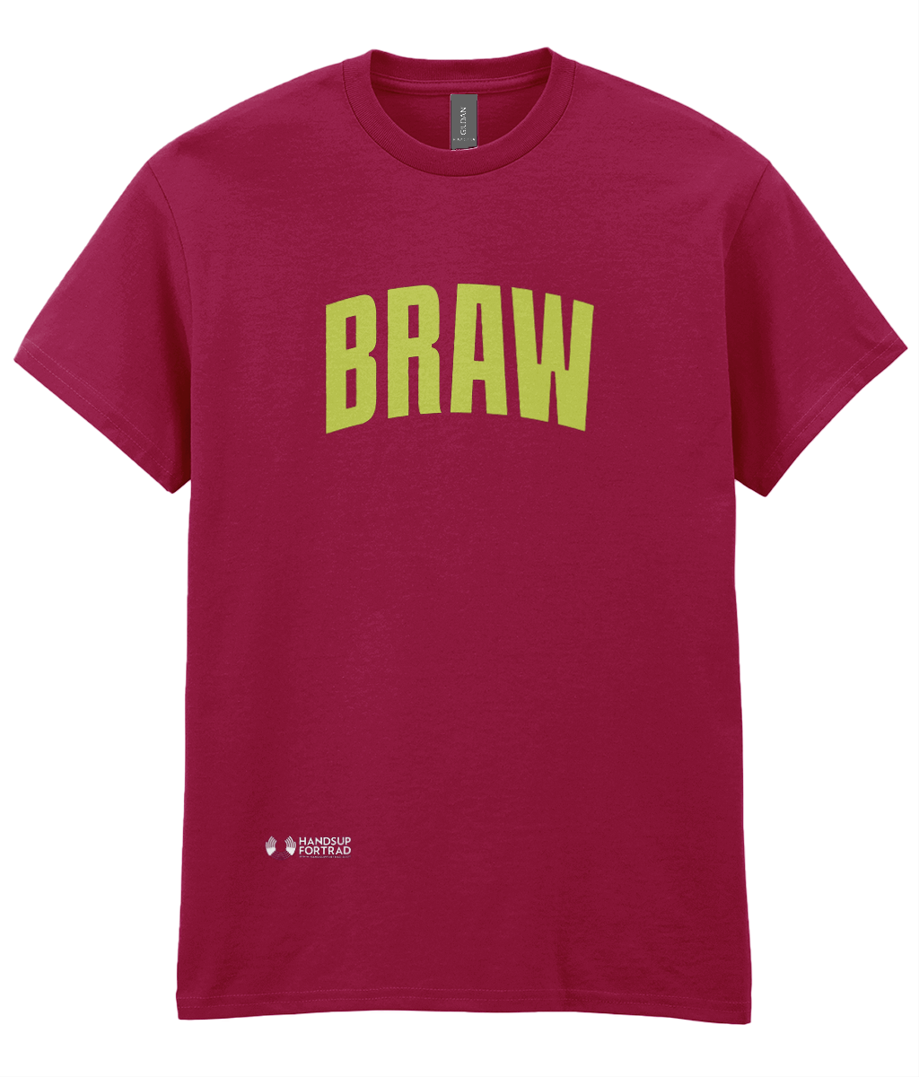 Braw is the Scots word for brilliant, excellent or great. It reminds me of the film Wayne’s World! Anyway why would you not want to wear a t-shirt that shouts braw to everyone you meet! All proceeds from these t-shirts go to support Hands Up for Trad and we really appreciate it! T-shirts are available in Indigo hush (as seen in picture), red, orchid flower (purple), and black.